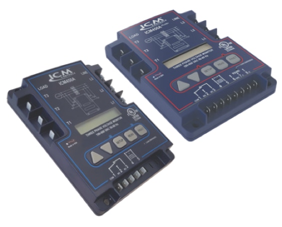 The ICM450A and ICM450A+ are the latest 3-phase Voltage Monitors from ICM providing superior motor protection from premature failure and damage caused by common voltage faults such as phase unbalance, over/under voltage, phase loss, and phase reversal. These newest models feature an easy-to-read, backlit display that makes quick work of adjusting the variable settings to better tailor the unit to the application.