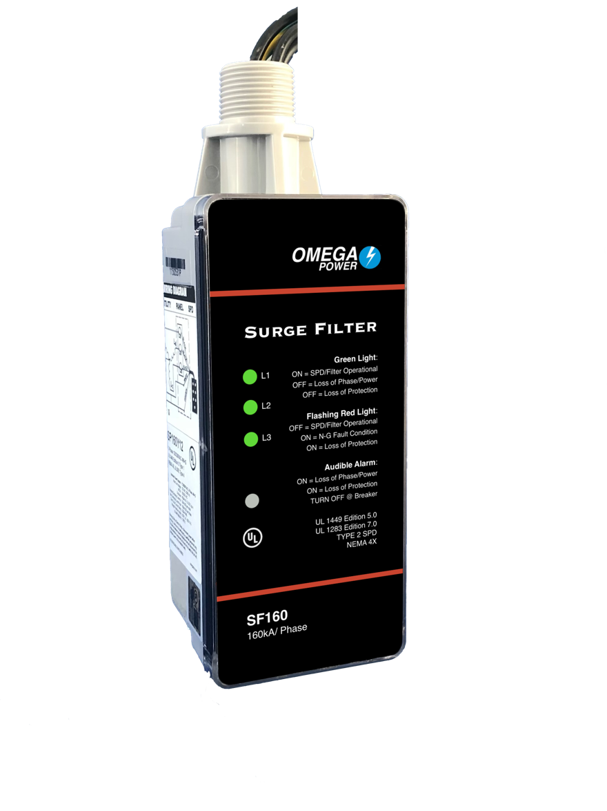 The Omega Power SF160 Surge Filter Series is an enhanced version of the SP160 Series. The SF160 Surge Filter is robust, with a 160kA per phase surge rating. The high peak surge rating increases survivability and overall life. The SF160 is UL 1283 Edition 7 and UL 1449 Edition 5 listed as an SPD for Type 2 locations.