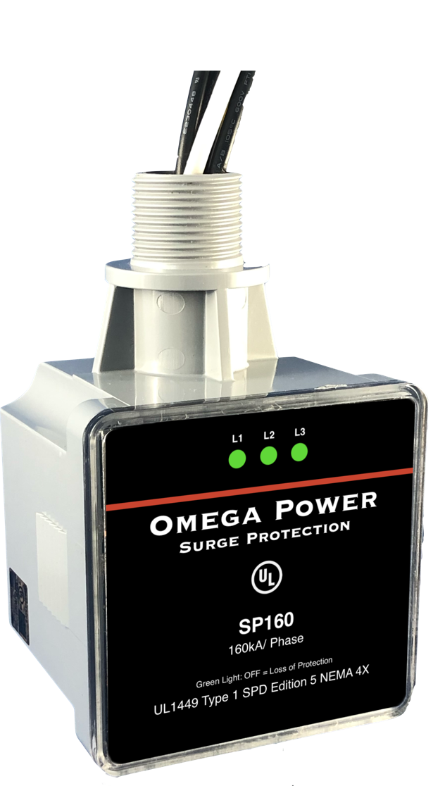 The Omega Power SP160 series of Surge Protective Devices (SPD) provide economical protection against damaging lightning and power surges. Engineered to provide durability and long life, even under the most adverse conditions. With a NEMA 4X enclosure rating, this product series is also well suited for outdoor applications. The SP160 is UL 1449 Edition 5 Listed as an SPD for Type 1 or Type 2 locations.