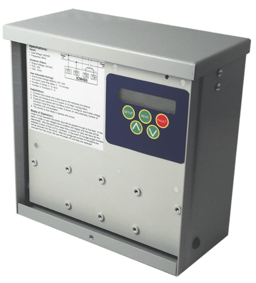 THE ICM492 constantly monitors line voltage and protects single-phase equipment against low and high voltage conditions, and rapid short cycling due to voltage fault or power interruption. Its easy-view backlit digital display makes it user friendly to read and monitor voltage conditions, and adjust parameters to meet specific needs.