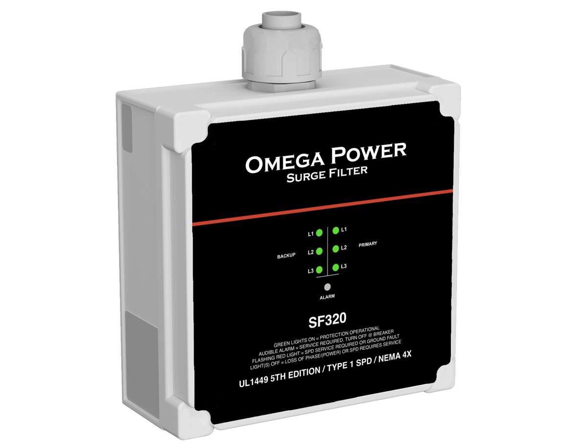 The Omega Power SF160 Surge Filter Series is an enhanced version of the SP160 Series. The SF160 Surge Filter is robust, with a 160kA per phase surge rating. The high peak surge rating increases survivability and overall life. The SF160 is UL 1283 Edition 7 and UL 1449 Edition 5 listed as an SPD for Type 2 locations.